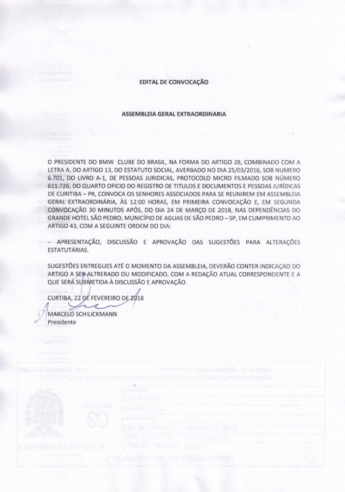 Segue imagem do Edital de Convocação para Assembléia Geral Ordinária que irá acontecer no dia 24/03/2018 às 11:00h no Grande Hotel São Pedro, na cidade de Água de São Pedro - São Paulo.